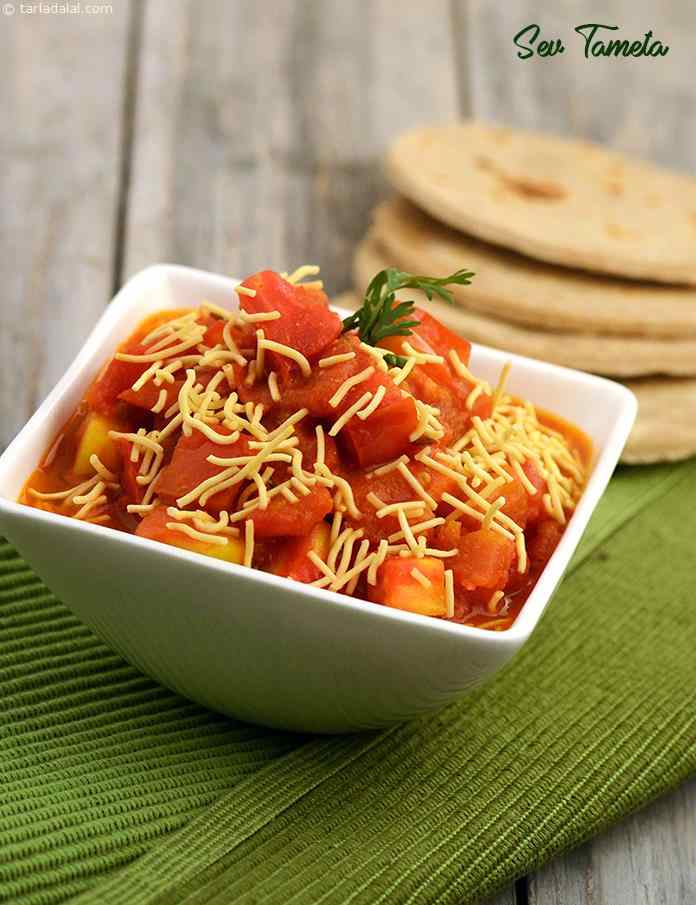 Sev Tameta is made using juicy tomatoes served with heaps of besan sev. The gujrati version of the dish is a bit sweeter with the inclusion of jaggery.